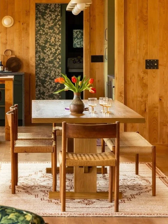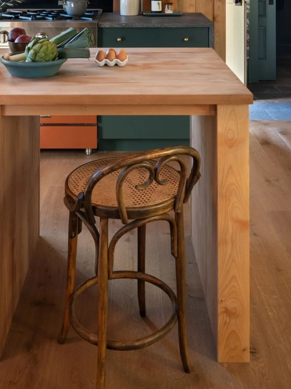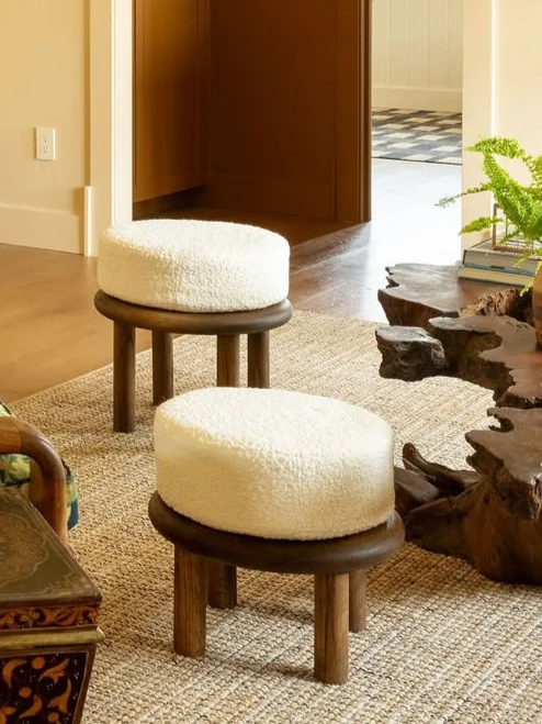 Bases made of solid red oak. New upholstered cushion covered in cream boucle.