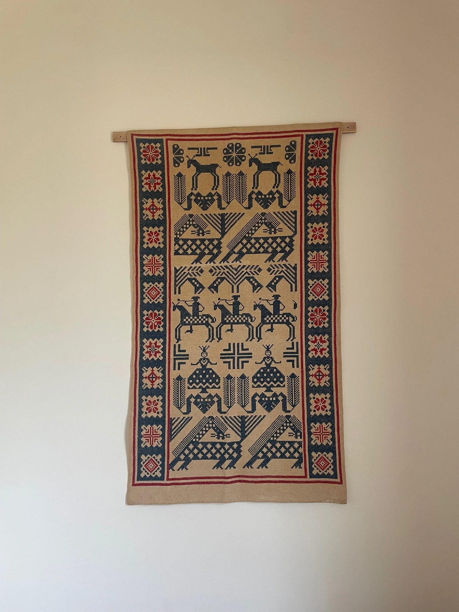 Handstitched artwork on old feed sack material. Some slight water damage but does not detract from the piece.
