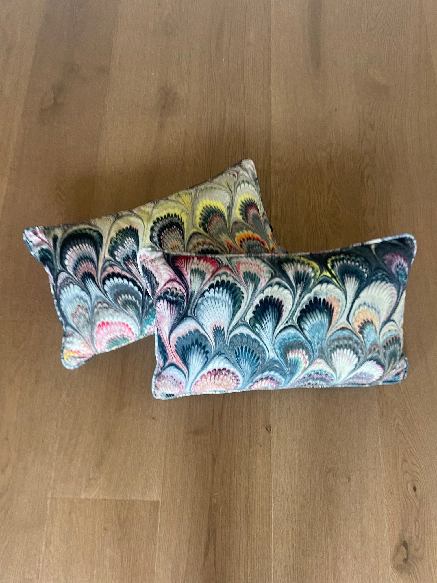 High end designer fabric. 20” x 12” piped pillows with zipper closure. Coordinating solid grey fabric on back. Down inserts included.